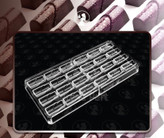 ابعاد قالب: 28 در 12.5 در ارتفاع 2.5 سانتی متر جنس: پلاستیک سخت عدم چسبندگی شکلات به قالب مقاوم در برابر ضربه قابلیت شست و شو: دارد